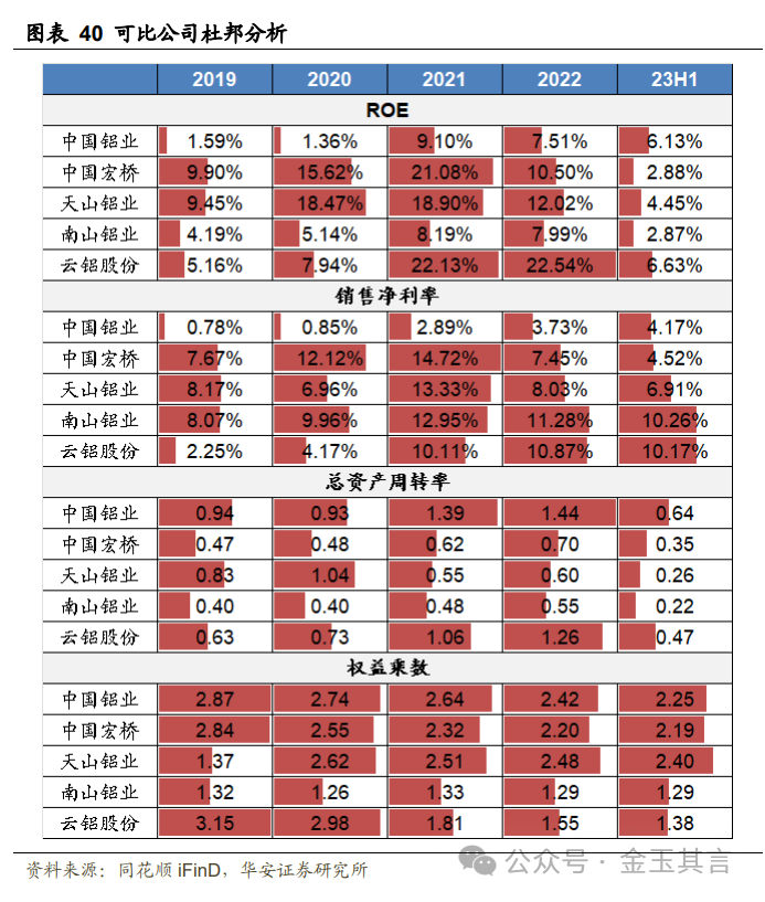 ROE角度:行业利润率受铝价波动影响,周转效率逐步改善。中铝、宏桥、天山2022年净资产收益率分别为7.5%、10.5%和12.0%,拆分来看:2021年铝价相对较高,相关公司利润率均高于往年,23H1利润率下滑主因铝价下滑,2023年下半年以来铝价回升,铝板块盈利能力有望持续修复。周转方面,2022年行业总资产周转率同比提升明显。