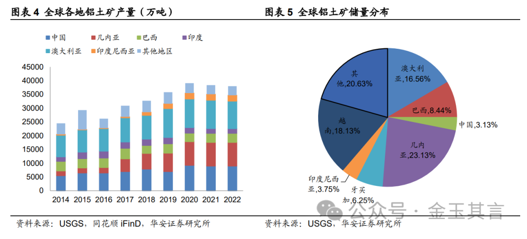 铝土矿储量集中,几内亚矿藏丰富。根据中国驻几内亚共和国大使馆经济商务处的调研,几内亚拥有世界上最大的高含量氧化铝铝土矿藏,铝土矿储量超过400亿吨,占全球总储量的三分之一以上,居世界第一。几内亚的矿石具备矿藏集中、矿石品位高、易于开采等特点。根据USGS的数据,2022年几内亚铝土矿储量74亿吨,占全球总储量的23%,2022年几内亚和澳大利亚、越南的铝土矿储量合计接近全球储量的60%,矿产资源相对集中。中国的铝土矿储量有限,2020年以来呈现产量减少的状态,因此国内铝土矿更加依赖进口。