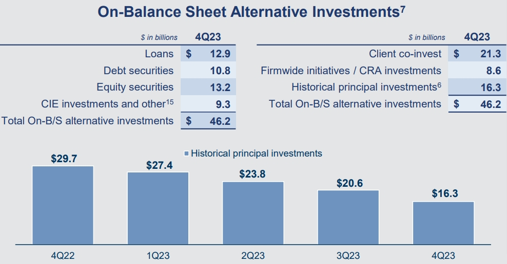 市场关注的另一个数据是,高盛资管的自有资金投资情况。据高盛资产&财富管理部门最新的财务文件显示,截至2023年四季度末,高盛资管的自有资金投资余额为163亿美元,相较于2022年年末,减持规模达134亿美元(约合人民币960亿元),已经连续四个季度减持。