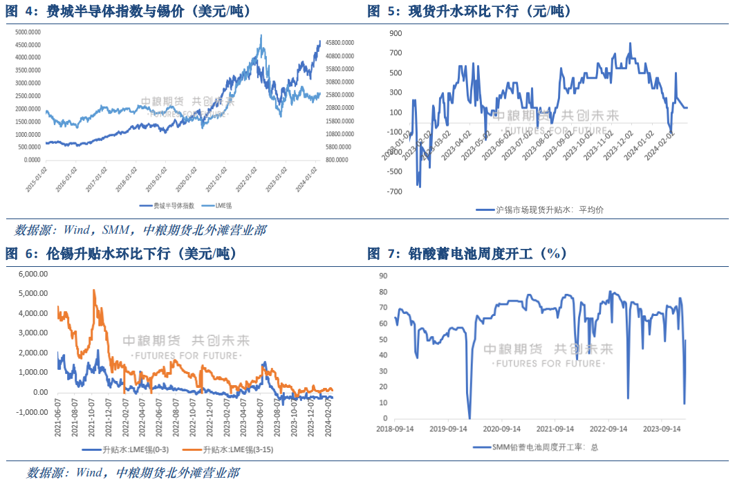 受益于半导体周期回升及AI景气,终端需求预期较好,等待初端现实验证。全球半导体出货量于23Q2见底回升,节后消费电子表现良好,机构预计的全年智能手机、PC等出货量同比或有明显恢复;高景气AI带来的芯片需求也助力半导体周期回升,高通、苹果、Meta等公司业绩显示相关领域增长良好,关注本周华为发布会;与锡价高度相关的费城半导体指数自23年10月底开始较快上升。而较好的预期也需要看到实际兑现,从节后第一周来看,国内需求暂缺亮点,上周现货成交整体偏弱,下游倾向在周内低位刚需采买,对涨价接受度低(成交价格多在217000元/吨以下),初端企业还在节后复工的过程中;企业反馈锡化工、镀锡板及光伏订单相对尚可。