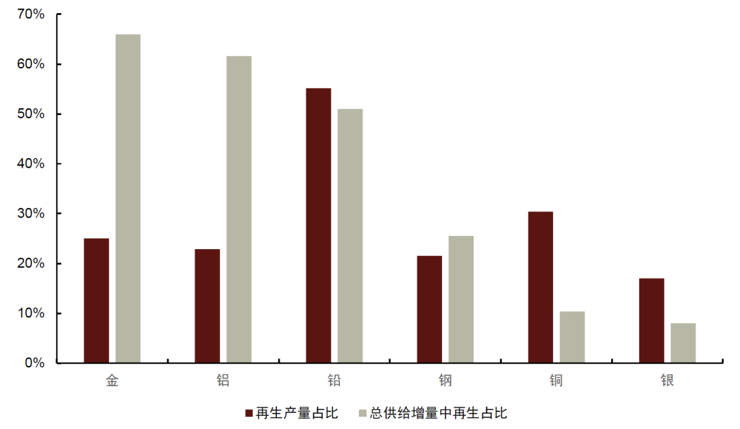 有色金属:“中国需求”故事的回响。在过去二十年间,中国的建筑、电力、交运、机械等下游行业处于高速增长期,“中国需求”在很大程度上影响了全球的有色金属平衡表。而随着这些终端产品逐渐步入服役末期,蕴藏在其中的再生金属原料也将得以释放。目前,中国再生金属产量占比已经基本超过全球平均水平,但相对于成熟经济体而言,这一比例仍然较低。截止至2022年,中国再生铜占比为30%,再生铝占比为23%,再生铅占比为55%。而美国这一比例为60%、51%和90%。这一方面是由于中国的废料供应仍处于爬坡期、且回收系统尚待完善;而另一方面或是由于发达国家再生金属行业利润较为丰厚,企业对于投资再生金属产能较为积极。