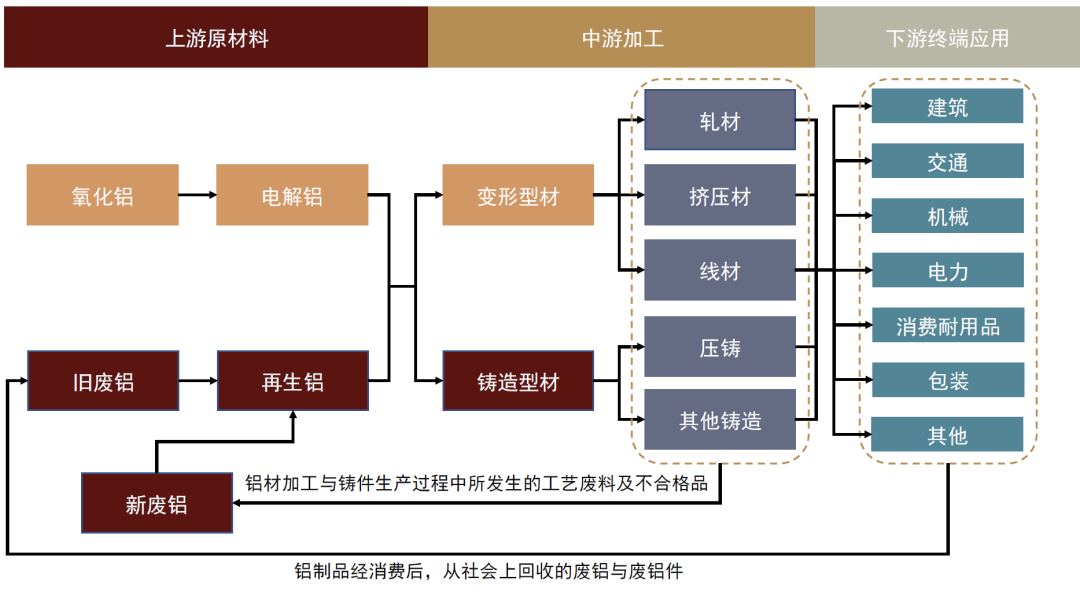 再生铝,是指由废旧铝或含铝的废料,经重新熔化提炼而得到的铝金属。相较于从铝土矿开采到终端铝制品的原生铝产业链,再生铝产业链较短:主要由上游废铝原料回收,中游再生铝锭、铝棒铸造和铝合金加工,以及下游铝制品应用组成。其原料分为新废铝与旧废铝。其中旧废铝来自经消费后从社会上回收的铝制品,而新废铝则指的是铝材生产加工过程中所产生的工艺废料或不合格品。大部分新废铝都由生产企业自行回收熔炼成原牌号合金,而不纳入废铝的生产统计。