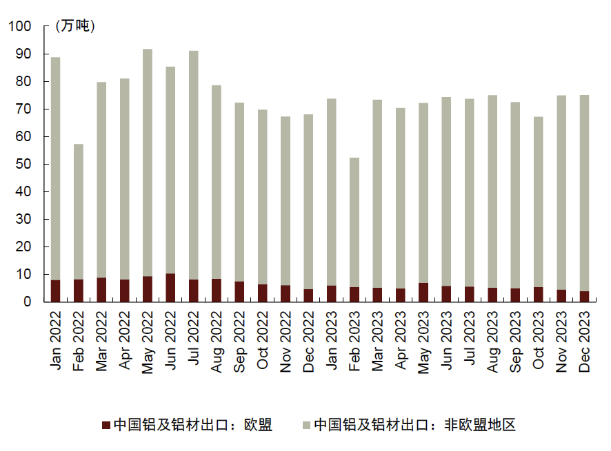 随着CCER碳排放交易的重启,电解铝企业纳入全国碳市场在即,再生铝的绿色价值有望显化。根据近半年的CCER均价75元/吨计算,每吨再生铝蕴含碳价值约为825元/吨。同时,下游行业的ESG目标也提升了其对于低碳铝的需求,甚至出现再生铝的“绿色溢价”。出口方面,欧盟碳边境调节机制(CBAM)自2023年10月1日起正式步入三年过渡期,将于2026年正式开始征税[5],目前仅覆盖直接排放。CBAM征税对象包含了除7602、7615以外所有76章项下的铝商品。2023年,欧盟占我国铝及铝制品出口约为7.5%。未来碳关税生效后,再生铝制品获得的碳成本优势不容小觑。