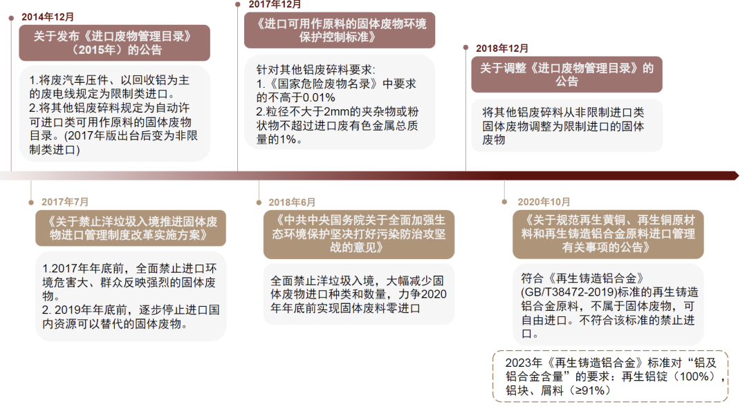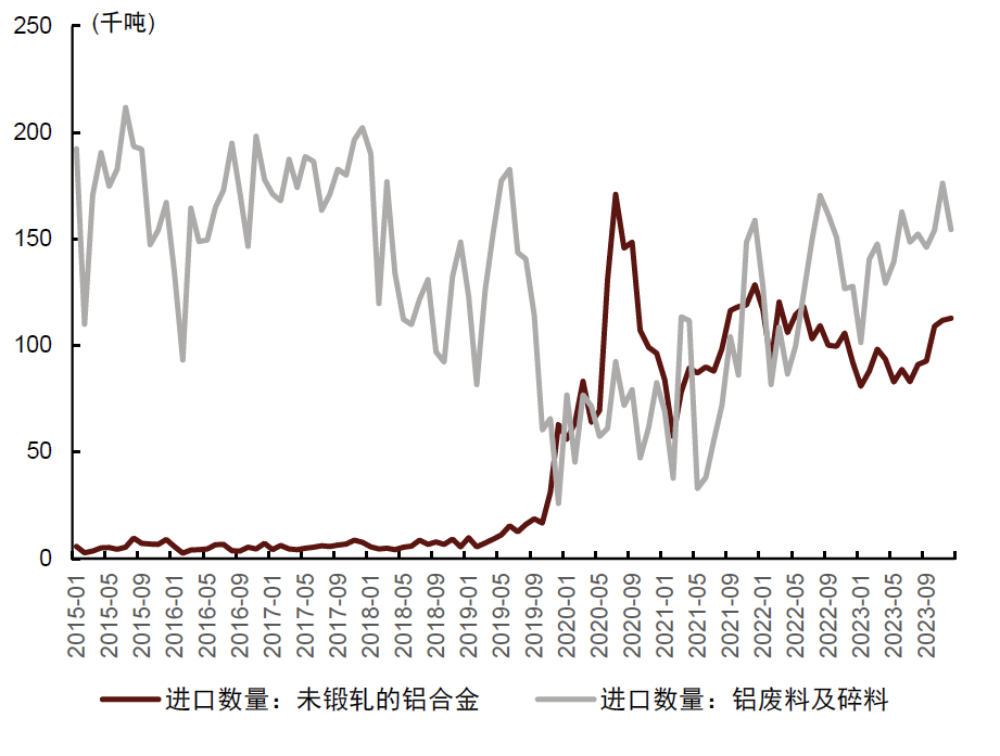2000-2017年间,我国再生铝产业迅速扩张。一批中大规模企业在沿海地区成立,需要大量进口废铝以补足原料需求。但随着环境保护工作力度加大,国务院办公厅2017年发布《禁止洋垃圾入境推进固体废物进口管理制度改革实施方案》[3],铝废料进口标准逐步收紧,进口数量出现回落。作为应对,更多厂商倾向于先在国外将废铝加工成再生合金锭,再以未锻轧铝合金的形式进口。这或能部分解释自2019年起未锻轧的铝合金进口量的显著提升。而自2020年起,符合《再生铸造铝合金》标准的原料不再属于固体废物,可以自由进口。废铝进口量出现回升。展望后续,我们认为随着进口检验标准的明确,进口废铝将趋于品质标准化、渠道规范化,进口数量将维持平稳增长。
