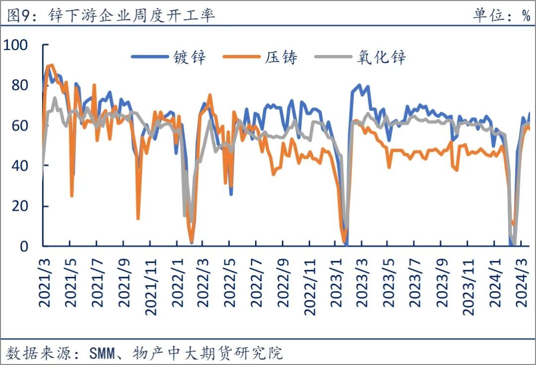 根据锌下游的初端开工率数据,三大板块在农历年后开工环比上升,但均不及去年同期。锌的下游企业同有色其他品种一样,出现新增订单不足的情况。镀锌企业开工逐步恢复,光伏订单有好转预期。但因锌价走高,镀锌利润较薄,企业多以消耗原料库存为主,刚需采购锌锭。氧化锌大部分企业生产步入正轨,橡胶级氧化锌订单表现亮眼,全钢胎生产亦在恢复,电子级及化工级氧化锌订单伴随下游开工复产亦有较好表现,预计整体氧化锌开工率或在二季度维持高位。压铸锌合金企业因终端市场仍有需求,逐渐恢复正常生产。从原料及成品库存来看,当前初端消费各板块库存普遍处于季节性均值附近,但下游成品库存仍有一定提升空间,尤以镀锌这一占比高达60%的消费板块为代表。市场对于“金三银四”旺季仍存期待,静待下游开启补库周期。