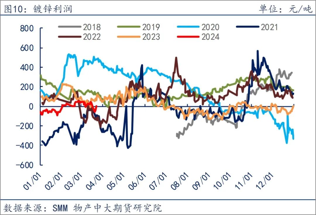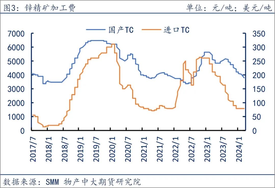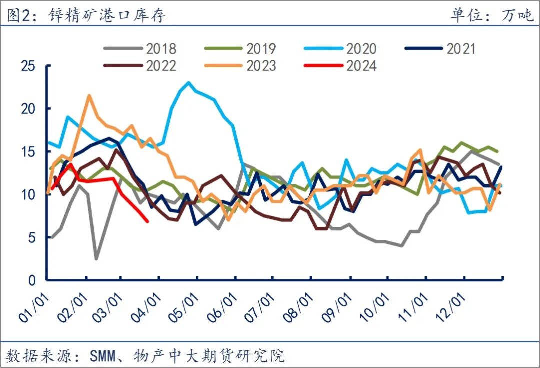 从国外矿山投放产能来看,根据去年年底我们预估的新增投放量,海外锌精矿今年预计新增38万吨,同比约+2%。然而多数矿山计划投产时间都在今年下半年,预期供应增量较大的矿山之一,俄罗斯Ozernoye锌精矿预计将在今年Q3开始投产,2025年满负荷运行,新增产量约10万金属吨;Polymetals Resources在澳大利亚的Endeavor预计在今年下半年开始生产第一批锌精矿,预计增量在8万金属吨。另外因成本问题、矿山品位下滑、突发安全事件等原因,海外矿山近期扰动仍较大。伦丁矿业Neves Corvo铜锌矿突发冒顶事故,已暂停运营,该矿山原本计划2024年至少生产12万锌精矿。澳大利亚Dugald River矿因洪水影响,运输受阻,据财报数据显示,其2023年生产锌精矿15.18万吨;另外南非的Gamsberg矿因生产受阻,月产量下降明显。Gamsberg锌精矿基本都发往国内,其2023年产量17.4万吨,受此影响预计近月来海外发往国内的数量减少2万吨以上。总体来看,上半年海外矿石供应偏紧的格局难以改变。同时前期比价低位,给到进口矿流入国内机会有限,港口锌精矿库存亦处于同比低位,这就加剧矿紧缺情况,进口矿TC进一步下滑。
