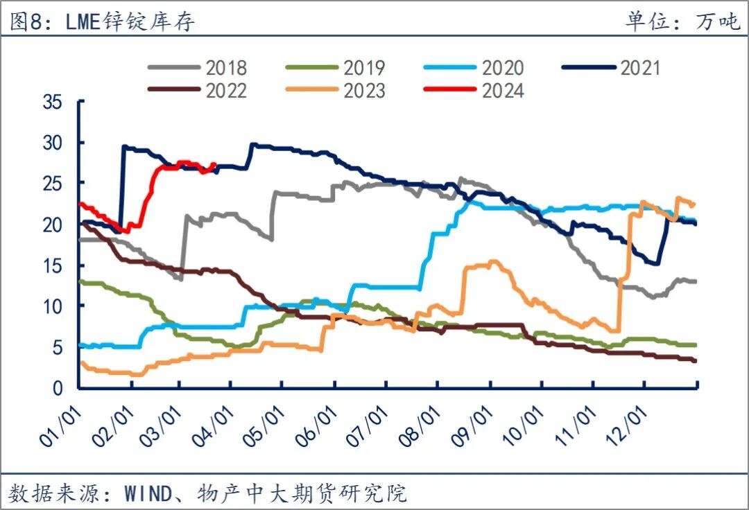 进口方面,根据海关数据显示,2024年1月锌锭进口量为2.51万吨,2月进口量为2.52万吨,累计进口5.03万吨,同比+666.8%。春节过后随着比价的修复,进口窗口开启,预计3月进口量2.5万吨左右,进口锌锭的流入一定程度上弥补冶炼厂增量的不足。静态来看,海外高企的库存以及月间明显的contango格局印证了海外短期仍处于供需过剩的格局。