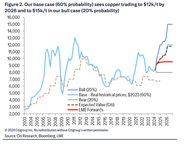 到2026年,花旗预计,铜价有望在基准情景下涨至每吨12000美元,在乐观情景下涨至每吨15000美元。