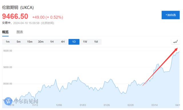 截至发稿,伦敦期铜在每吨9467美元附近交易,距10000美元还有约6%的涨幅。进入3月,伦敦期铜节节攀升累计涨幅超过10%,涨势十分迅猛。