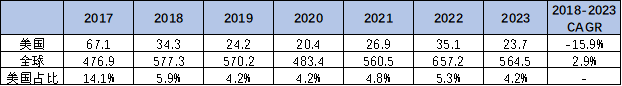 近年来,美国自全球进口铝及铝材产品(HS7601-7608项下)维持在500-730万吨,自中国进口量已降至20-30万吨,仅占其自全球进口的3%-4%。2023年美国自中国进口铝及铝材产品19.7万吨,2011-2023年年复合增长率为-3.6%。