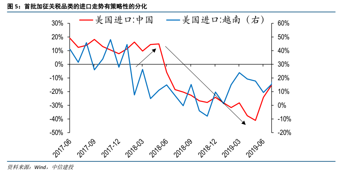 第二,参照历史经验,短期钢铁和铝制品对美出口或出现较大改善。由于市场预期到关税即将提升,会出现策略性的提前进口行为。参照2018年中美贸易冲突期间的规律,在关税正式落地前,中国相关商品对美出口反而会有改善,关税落地后则出现趋势性下行。
