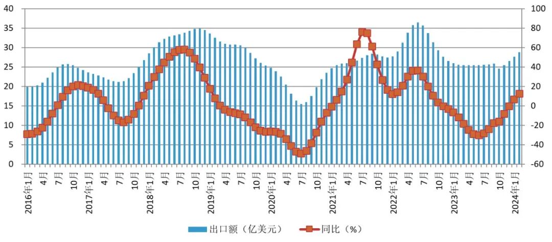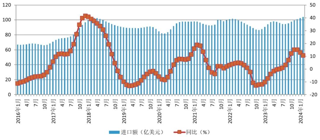 经季节调整,2月份有色金属产品(不含黄金)进口额为104.1亿美元,同比增长10.7%;出口额为28.8亿美元,同比增长12.5%。