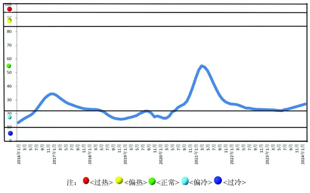 2024年3月,中国有色金属产业景气指数为27.0,较上月上升0.6个点,从总体来看,3月景气指数持续上升,但仍处在 “正常”区间下部。