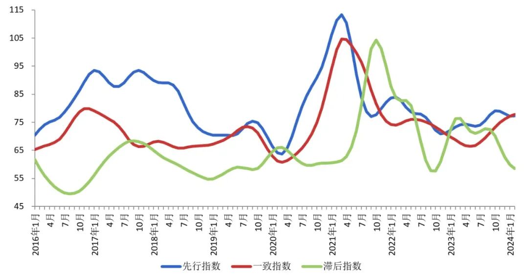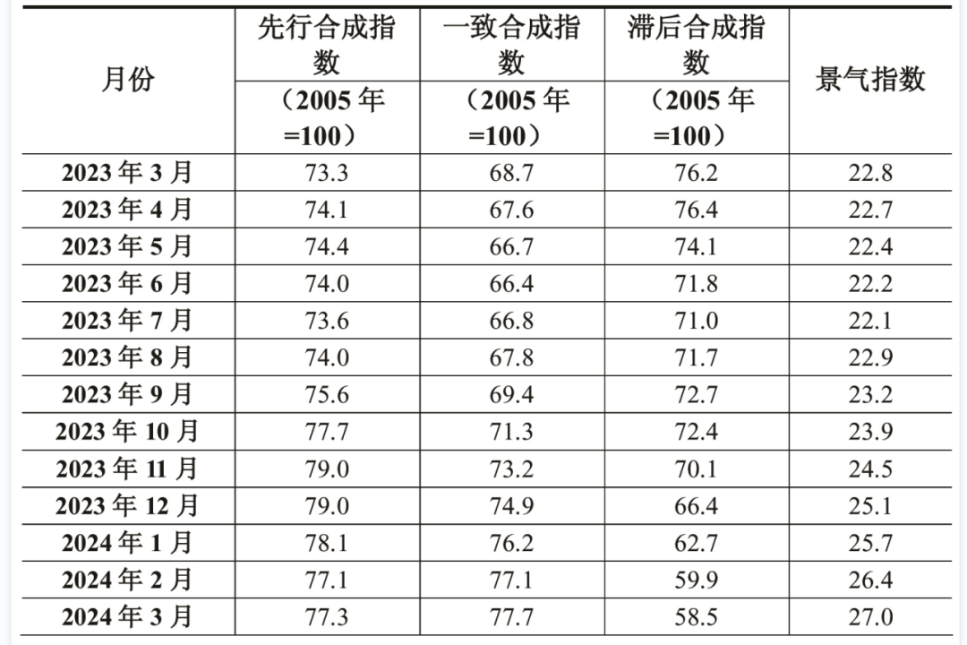 2024年3月先行指数77.3,较上月上升0.2个点。经季节调整后,同比出现上升的指标有5项,分别是M2指数、汽车产量、家电组合、固定资产月投资额和有色金属进口额等指标,升幅分别是8.4%、7.1%、5.2%、8.3%和9.6%。环比出现上升的有5项,分别是M2指数、商品房销售面积、家电组合、固定资产月投资额和有色金属进口额等指标,升幅分别是0.7%、1.4%、2.2%、7.0%和1.6%。