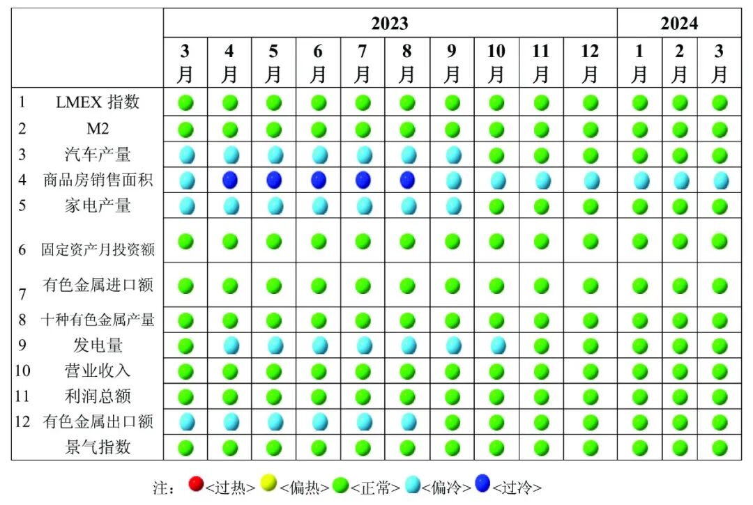 在构成有色金属产业景气指数的12项指标中,LMEX指数、M2、汽车产量、家电产量、有色金属固定资产月投资额、有色金属进口额、营业收入、十种有色金属产量、发电量指标、利润总额及有色金属出口额等11项指标位于“正常”区间;商品房销售面积指标位于“偏冷”区间。