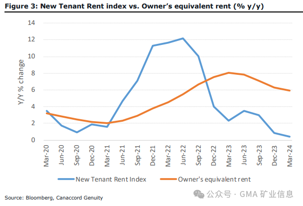 目前通胀的最大驱动因素之一是业主等效租金(OER)的统计结构,其按年同比增长率约6%,占CPI篮子的27%。核心CPI年率为3.8%,但不含房租的CPI年率为2.4%。考虑抵押贷款利率历来居高不下,新屋开工疲软。在人口调整的基础上,房屋开工率较2022年4月的近期峰值下降了28%,接近或低于前几次衰退的水平。基于市场的租金指标显示,租金通胀正在消退。下图表显示近年新租户租金指数与OER的对比情况:
