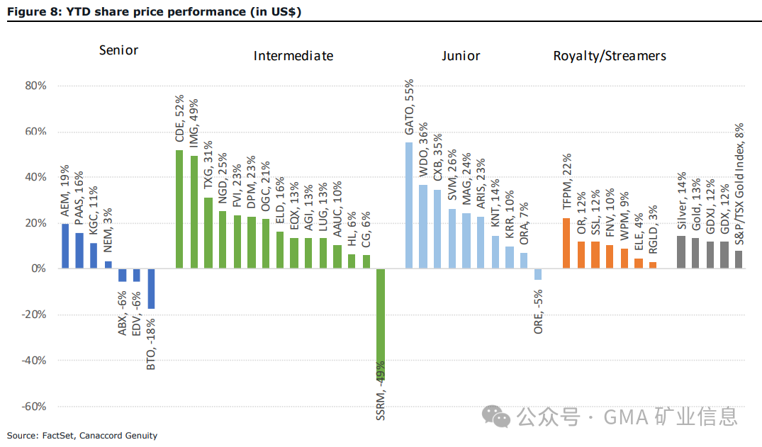 金价在4月19日以创纪录的2392美元/盎司收盘后,在上周三回落76美元/盎司(-3.2%),随后收复失地,上周收盘于2338美元/盎司,下降了2.3%。鉴于金价自2月底以来上涨了近350美元/盎司,业内认为上周的走势是自然回调。尽管本周金价走软,但金价年初至今仍上涨13%。黄金股方面,由于Newmont、Agnico、Alamos和Eldorado的业绩好于预期,2024年一季度公布的季报强势开局,黄金股上涨。S&P/TSX全球黄金指数(以美元计算)上周上涨1%,年初至今上涨8%;GDX年初至今上涨12%。下图表显示各类的黄金股年初至今的表现: