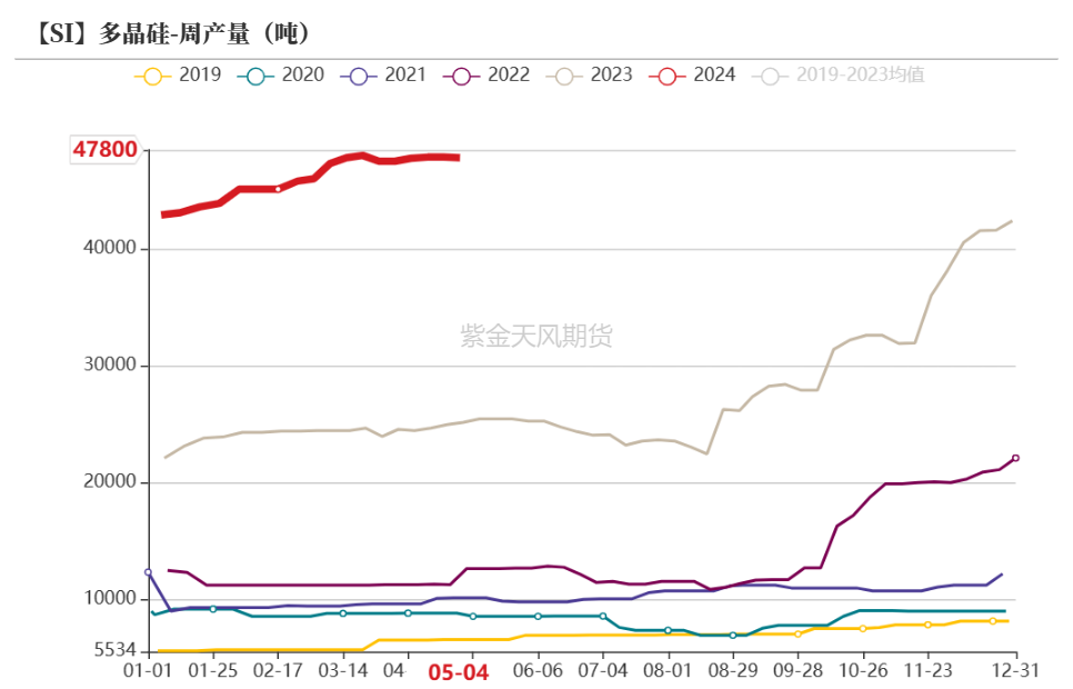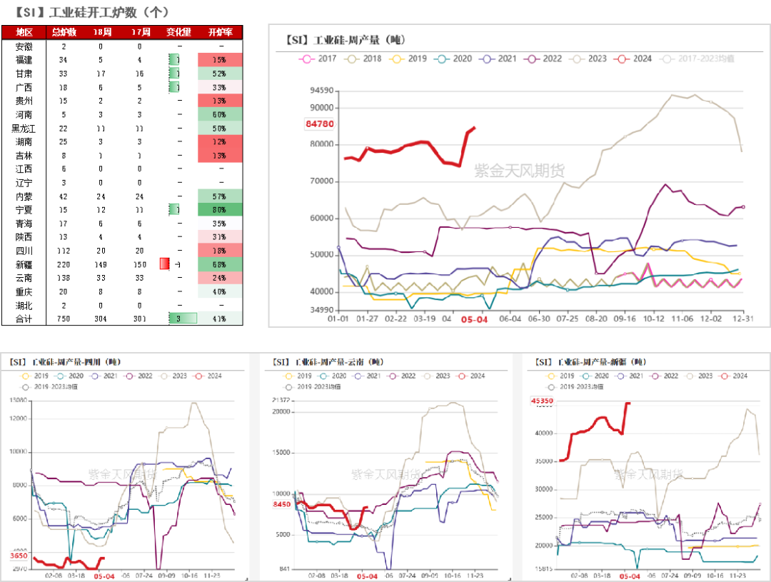 西南电价调整节奏和当前低位的期现价格均未给到充分的复产条件,但基于地区季节性产量增长的演绎和天气条件的逐渐恢复,西南6月复产提速的预期仍存。而就周度产量绝对值而言,供应输出量级仍然可观。