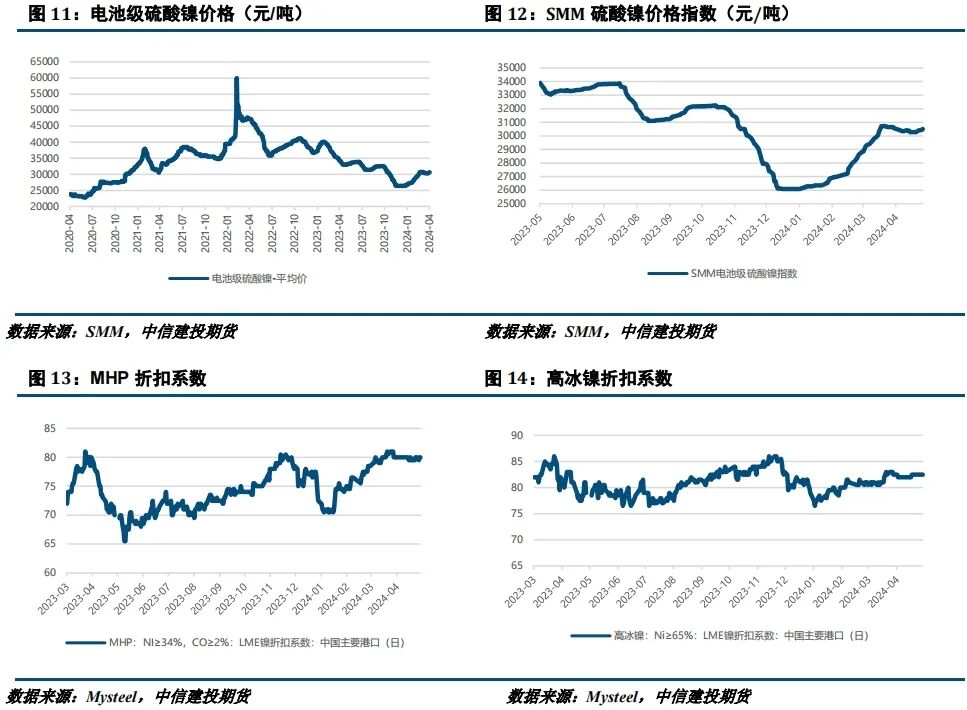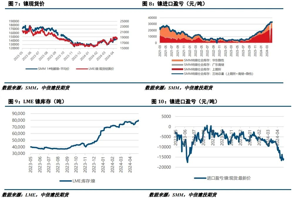 本月镍铁价格上涨。供应方面,目前印尼镍矿偏紧,镍铁成本支撑较强,而国内铁厂生产承压,已有部分厂家减产,市场内流通资源相对有限,SMM数据显示2024年4月底镍铁库存相较上月同期-19.70%。需求方面,在镍铁看涨情绪驱动下,部分钢厂将备货需求提前,市场成交火热。总的来说,目前国内镍铁供需偏紧,价格高位运行,后市走势关注矿端动向。