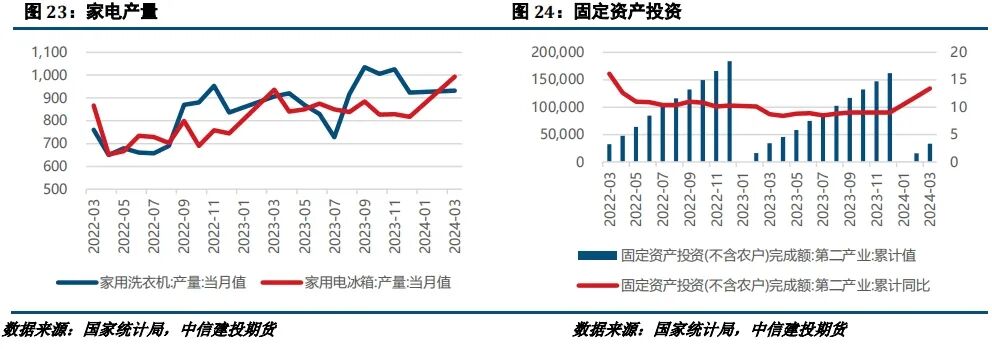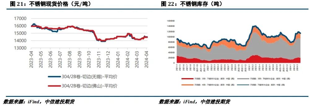 本月不锈钢现货价格上涨。供应端,Mysteel数据显示2024年4月国内43家不锈钢厂粗钢产量323.92万吨,月环比增加8.22万吨,月环比增加2.6%,同比增加15.16%,预计5月排产331.66万吨,月环比增加2.39%,同比增加6.15%。成本利润方面,在成本支撑走强下,不锈钢看涨情绪较浓,成交价上行,共同驱动钢厂利润回升。需求方面,看涨情绪驱动成交有所回暖,不过终端无论是地产还是基建表现均较为乏力,警惕市场情绪对需求的过度乐观。总的来看,4月不锈钢上涨主因成本因素,但成本端作用或更多是形成支撑,难以进一步助涨,在未观察到成交大幅回暖的背景下,我们提示供应端缺乏承接可能引发的回调风险。