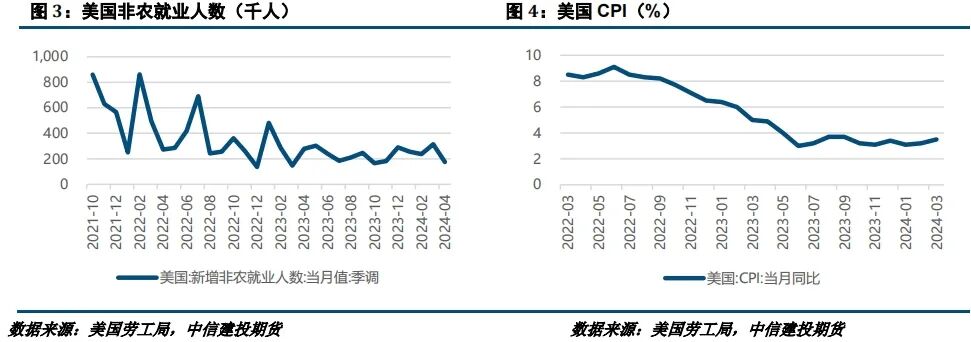 美国4月非农就业人口增加17.5万人大幅不及预期,失业率上升、大致处于2022年1月以来的最高,薪资增幅放缓。美国4月非农就业人口增幅显著不及预期,为六个月以来的最小增幅,失业率意外上升到3.9%,薪资增幅同比为3.9%,低于预期和前值,有利于通胀降温。数据公布后,交易员们对美联储首次降息的预期时间从11月提前至9月。