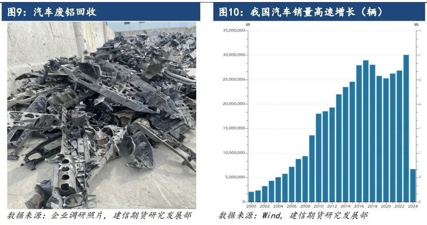 在我国,交通运输、建筑、包装是废铝的主要来源。建筑业方面,虽然建筑铝型材占比很大,但考虑相应的报废周期,短期成长性相对有限。包装业方面,目前我国易拉罐的回收率已高达99%,考虑到包装行业较短的回收周期以及较高的回收率,包装业废铝回收量的增量空间有限。交运行业方面,根据中国汽车工业协会数据,我国汽车销量从2000年的209万辆增长到2023年的3009.4万辆,年均复合增速达到12.3%,保有数量可观。