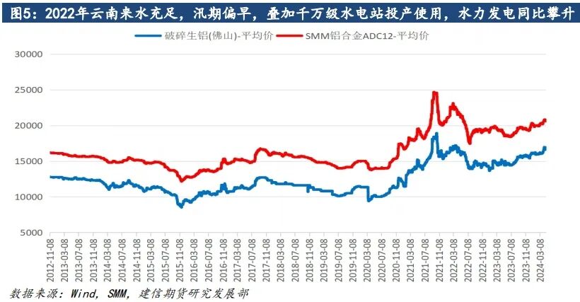 由于废铝不存在标准化产品,也不存在全国性市场报价,因此这里我们选取广东佛山南海有色市场对破碎生铝 (91%-93%)的市场报价作为废铝价格与ADC12市场价格走势进行对比,以供参考。可以看到,长期以来,ADC12与破碎生铝(91%-93%)市场价格的变动趋势基本保持一致,即再生铝的主要原材料与产品之间保持一定的价差关系。