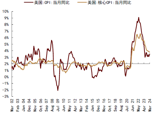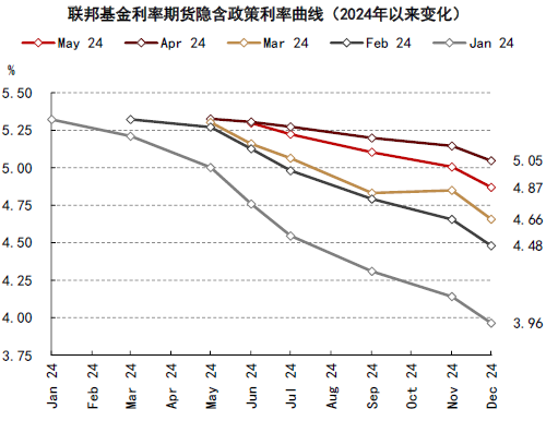 在本轮美联储货币政策周期中,黄金市场对于降息预期的交易开始于2022年四季度美国通胀的超预期回落。2023年7月美联储进行最后一次加息后,正式步入高利率平台期。2024年初以来,美国通胀数据已连续3个月超预期,促使降息预期不断调整。5月FOMC会议维持政策利率不变[2],货币政策声明承认通胀粘性,鲍威尔表示对降息信心不足,中金宏观组认为或显示美联储降息门槛已显著提高,维持此前将年内降息次数下调至一次、时点或在四季度的判断。虽然4月非农就业数据不及市场预期,失业率抬升至3.9%,中金宏观组认为劳动力市场或并未弱到需要降息的地步,何时降息或仍取决于通胀数据。