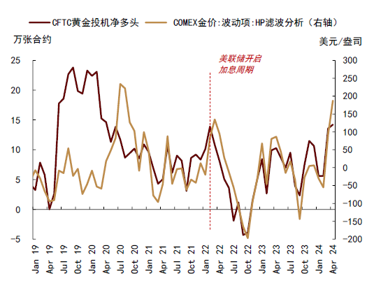 我们认为期货投机需求或为年初以来金价上涨的主要来源。基于HP滤波分析,我们将黄金价格拆分为波动项和趋势项两部分,2024年4月COMEX金价中枢达到2335美元/盎司,较去年12月抬升约272美元/盎司,其中,约181美元/盎司的涨幅来源于波动项、92美元/盎司的涨幅来源于趋势项。可以看到,2022年3月美联储步入加息周期后,黄金价格的波动项基本由期货投机需求主导,这一特征在年初以来依然延续。