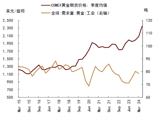 投资需求和央行购金之外,据世界黄金协会数据,2023年全球黄金需求中约50%为消费类需求,包含居民珠宝首饰消费和工业部门消费,合计约2490吨/年。在2022年8月发布的研究报告《贵金属:资产配置中的黄金角色》中,我们提出投资需求是黄金价格的传统定价因素,而随着2022-23年央行购金需求超预期抬升,我们认为其或已阶段性地成为了传统框架之外的第三重因素。