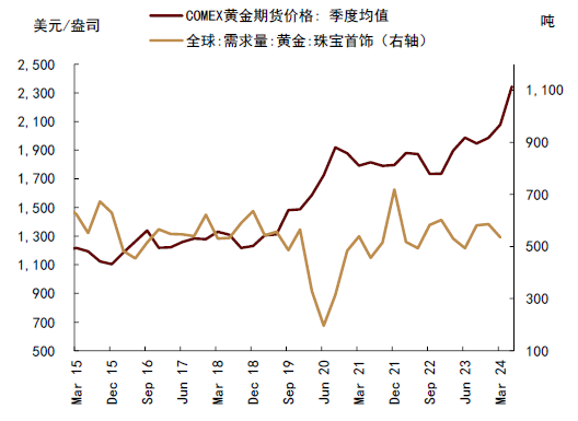 相较之下,我们认为实物消费需求对黄金价格的影响仍较有限。居民消费行为倾向于“买涨不买跌”,大多扮演着价格趋势的推动者,而难以成为趋势拐点的触发者。同时,实物消费需求也易受到高价格的反向抑制。可以看到,2020年以来黄金价格中枢上移的同时,实物消费需求维持相对平稳。