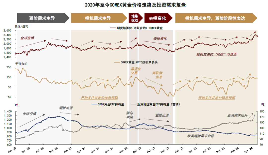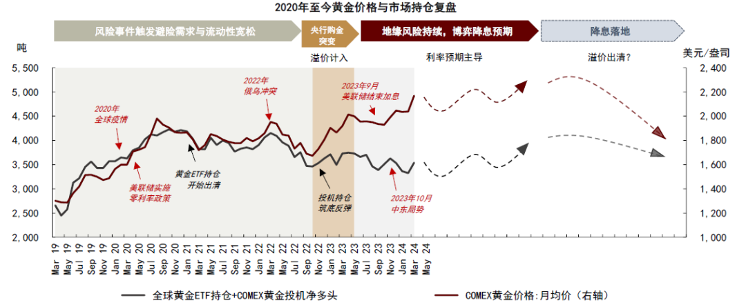 图表19:2019-2024年黄金价格与市场持仓分阶段复盘及展望