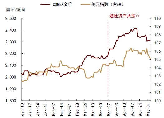 但二季度以来,我们看到市场风险偏好恶化带来避险需求,并对黄金价格形成一定支撑。一方面,从资产价格相关性看,3月底开始黄金价格与美元指数阶段性转为正相关性。从历史经验来看,黄金与美元同步上涨一般发生在风险事件发酵时期,二者同时受益于避险资产价值抬升。我们认为本次黄金和美元同涨或源于中东地缘政治局势导致的市场风险偏好恶化,也可以在黄金与石油价格的共振向上中得以印证。此外,我们再次重申将美元纳入黄金的价格分析框架可能会带来较大的预测风险。美元与黄金的相关性虽然较强,但二者既有基于利率的负相关性,又有同为避险资产的正相关性,相关性并不稳定。