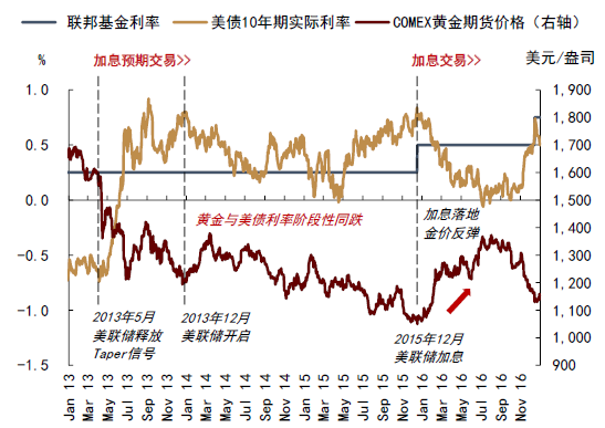图表17:2013-15年,美联储货币政策预期转紧阶段,黄金价格曾与美债利率阶段性同跌…