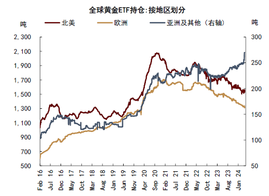 世界黄金协会数据显示,一季度全球黄金实物投资需求同比减少约76.7吨,其中主要是全球黄金ETF及类似产品需求同比减少约85吨,同时金条硬币等实物需求同比增加约8.4吨。在美国经济增长韧性仍存之际,以欧美地区为主导的全球黄金ETF需求维持相对弱势,符合我们的预期。
