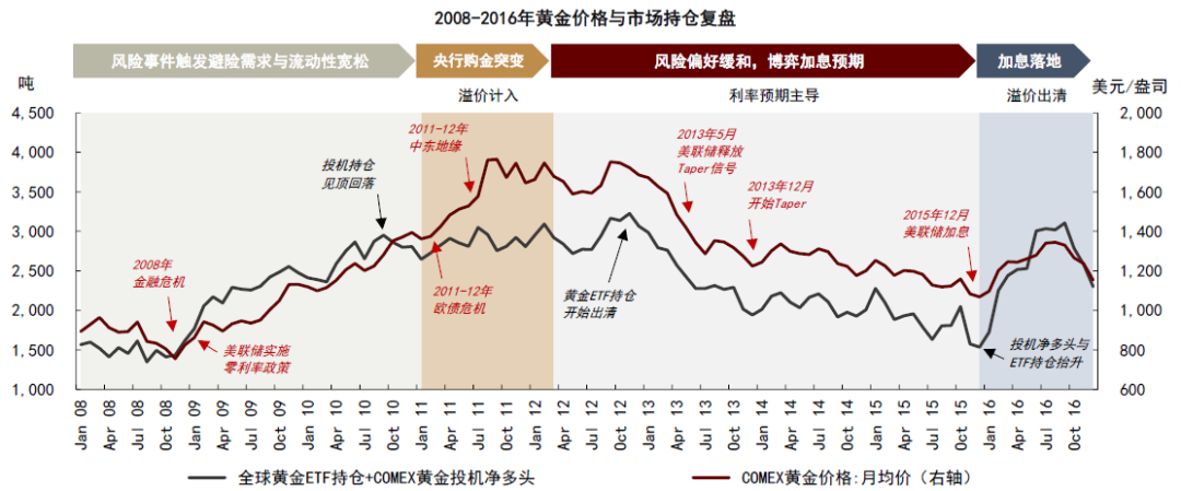 图表14:2008-2016年黄金价格与市场持仓分阶段复盘