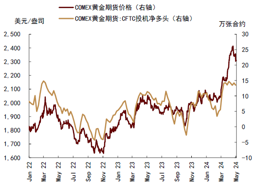 截至4月末,CFTC公布的COMX黄金期货投机净多头较1月末累计增加约154%,达到2022年以来高点,显示黄金市场投机氛围较浓,我们认为或为年初以来、特别是3月黄金价格上涨的主要来源。据世界黄金协会数据,1Q24全球黄金需求同比增加约32吨,其中,场外交易及其他需求增加约94吨,为主要增量来源,或也印证了市场投机交易对于黄金需求和黄金价格的支撑作用[1]。