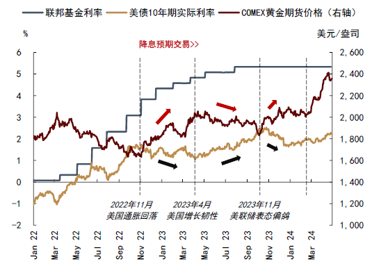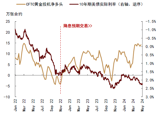 从交易逻辑来看,市场投机需求一般取决于利率环境变化,在货币政策转向的讨论阶段,会受到市场预期的较大影响。2022年11月,随着美国通胀数据超预期回落,期货市场开始对美联储降息预期进行提前定价,步入“买预期,卖事实”阶段,我们也曾发布多篇报告进行分析。可以看到,COMEX黄金期货投机净多头在美债利率上行放缓之后开始步入预期交易阶段,虽然交易行为的“买预期”会随着美国经济基本面与美债利率实际走势进行阶段性的修正和“卖事实”,但在美联储从加息退坡到利率平台期的政策转向阶段,降息预期交易难以被完全证伪,也使得黄金价格与美债利率的负相关性有所减弱。