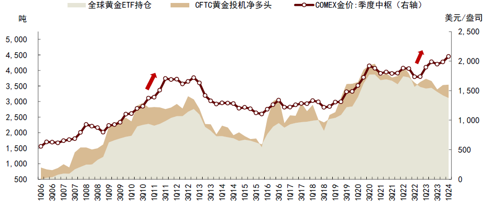 图表10:1Q24黄金价格与ETF持仓及投机头寸的分歧延续