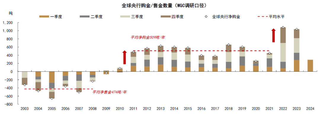 长期平稳的央行购金需求在2022-23年意外突变,成为冲击传统框架的第三重因素。2022下半年以来,黄金价格与我们在上文分析到的传统投资需求(全球黄金ETF持仓量和CFTC黄金投机净多头持仓量)出现背离,同时较美债利率模型持续存在较大偏差。我们认为主因或为曾经相对稳定的第三需求因素发生突变,对传统定价框架形成冲击。在2024年1月14日发布的研究报告《黄金:水涨船高还是预期交易?》中,我们提出黄金价格与市场持仓的持续背离在2010-2011年也曾出现过,当时全球央行从净售金方转变为净购金方,与2022下半年以来全球央行购金需求的超预期增加较为类似。