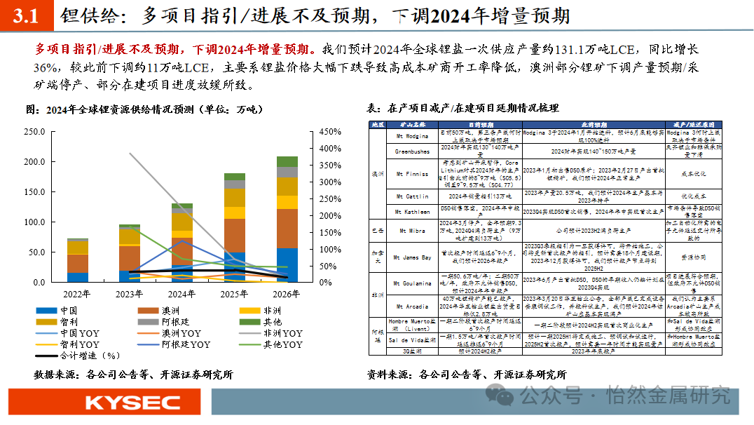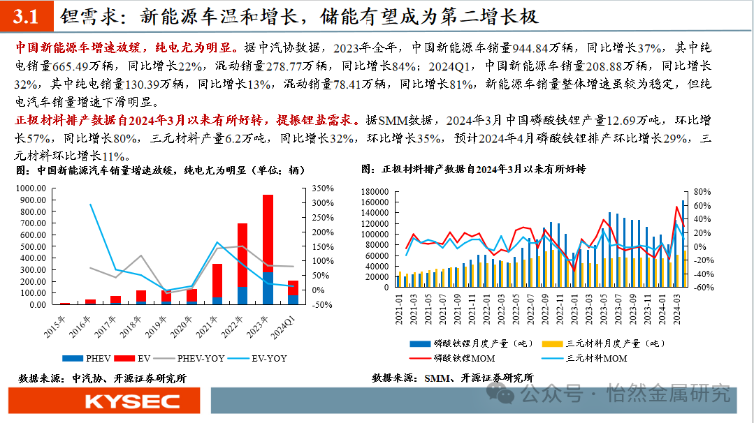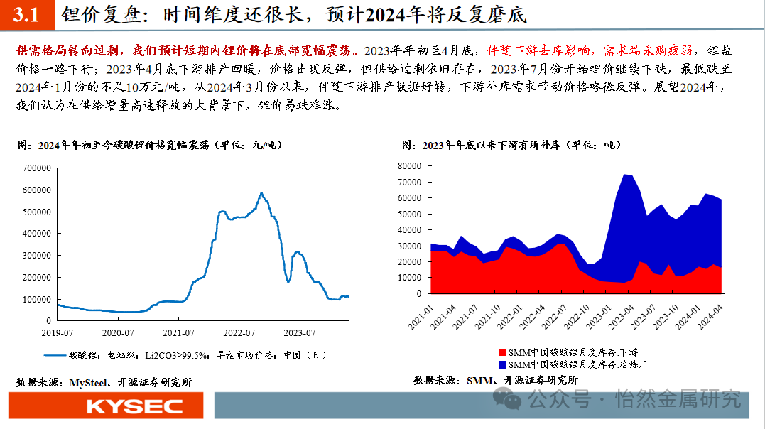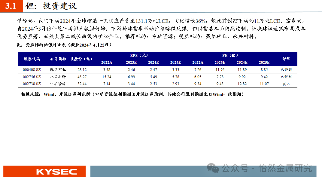 锂:供给端,我们下调2024年全球锂盐一次供应产量至131.1万吨LCE,同比增长36%,较此前预期下调约11万吨LCE;需求端,自2024年3月份伴随下游排产数据好转,下游补库需求带动价格略微反弹,但供需基本面仍然过剩。板块建议逢低布局成本优势显著,或兼具第二成长曲线的矿业企业。推荐标的:中矿资源;受益标的:藏格矿业、永兴材料。