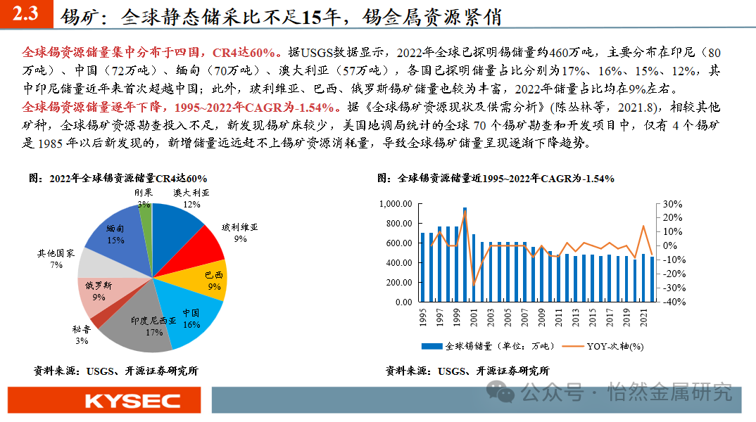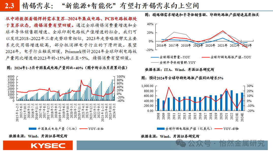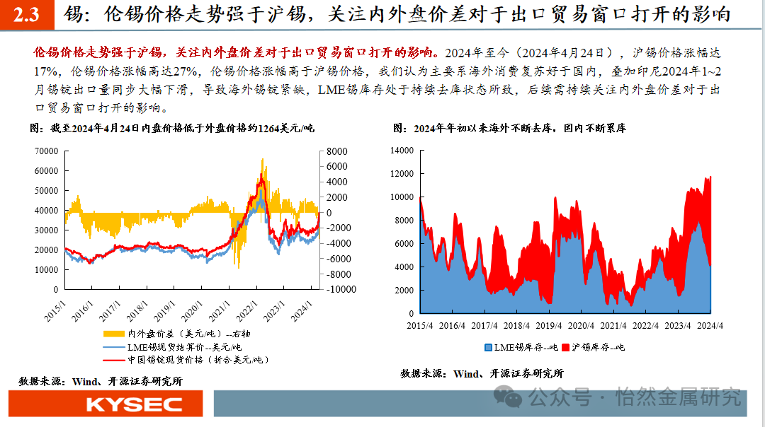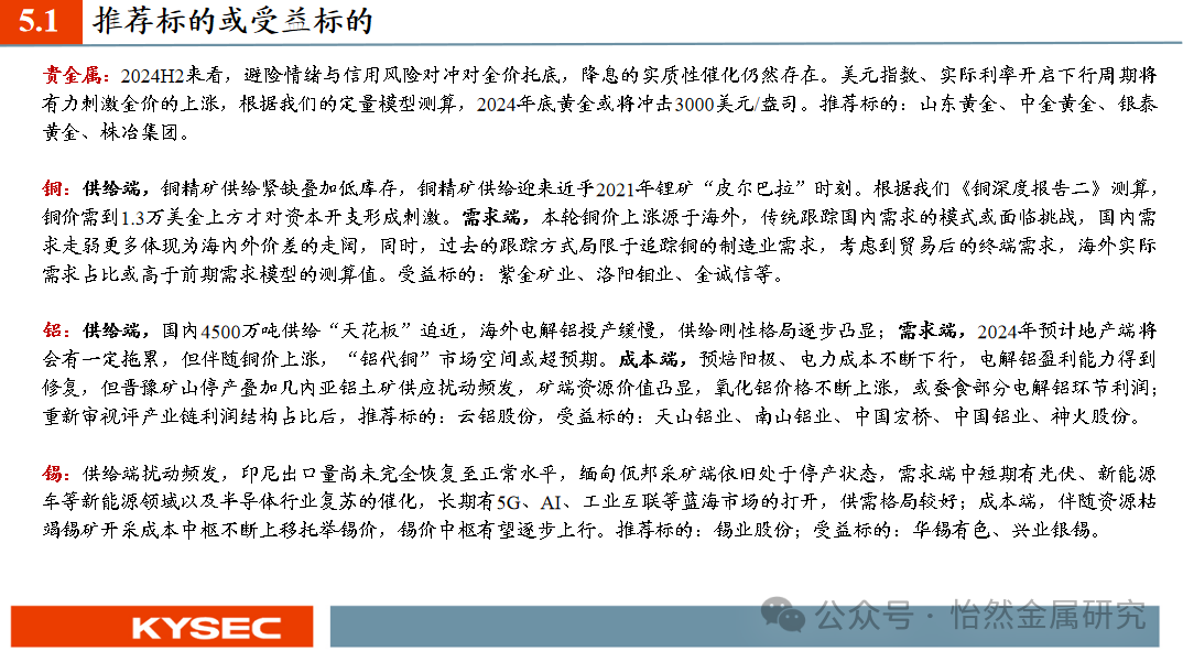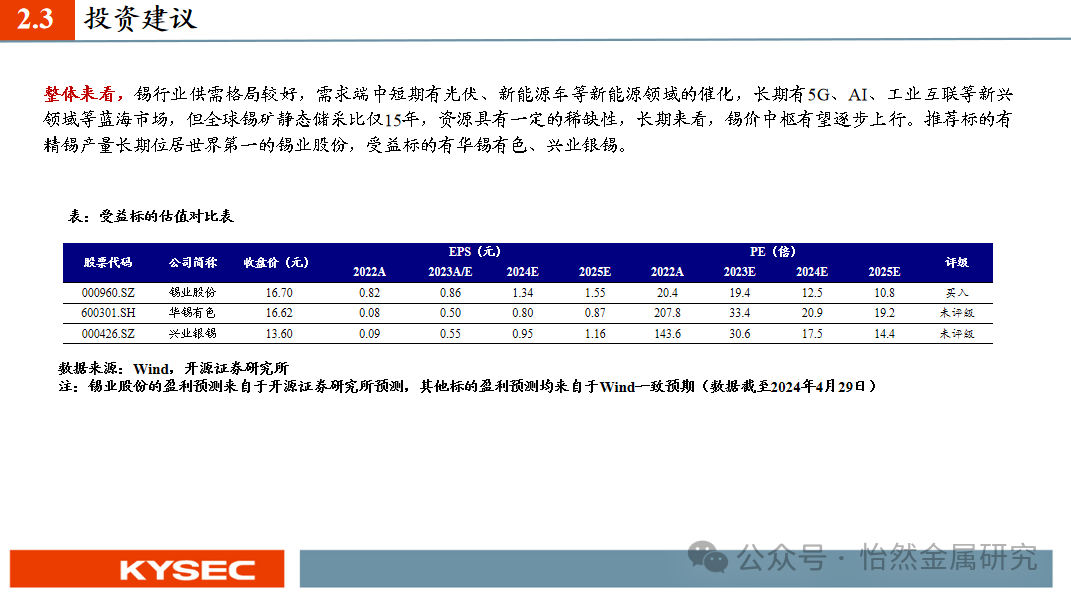 锡:供给端扰动频发,印尼出口量尚未完全恢复至正常水平,缅甸佤邦采矿端依旧处于停产状态,需求端中短期有光伏、新能源车等新能源领域以及半导体行业复苏的催化,长期有5G、AI、工业互联等蓝海市场的打开,供需格局较好;成本端,伴随资源枯竭锡矿开采成本中枢不断上移托举锡价,锡价中枢有望逐步上行。推荐标的:锡业股份;受益标的:华锡有色、兴业银锡。