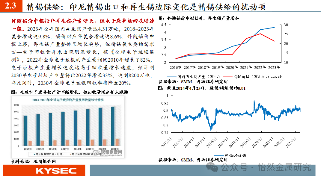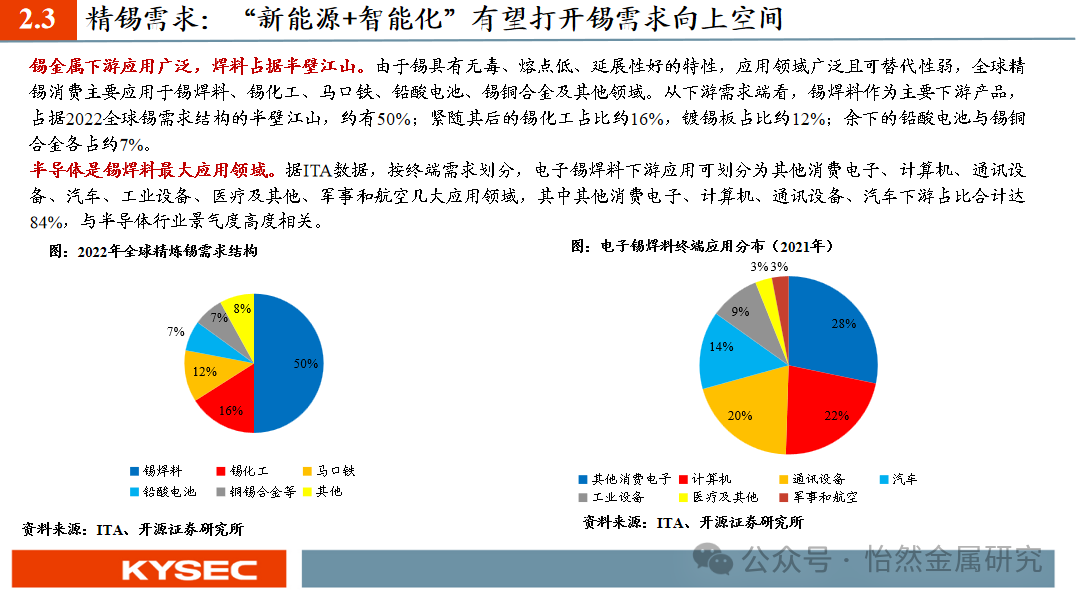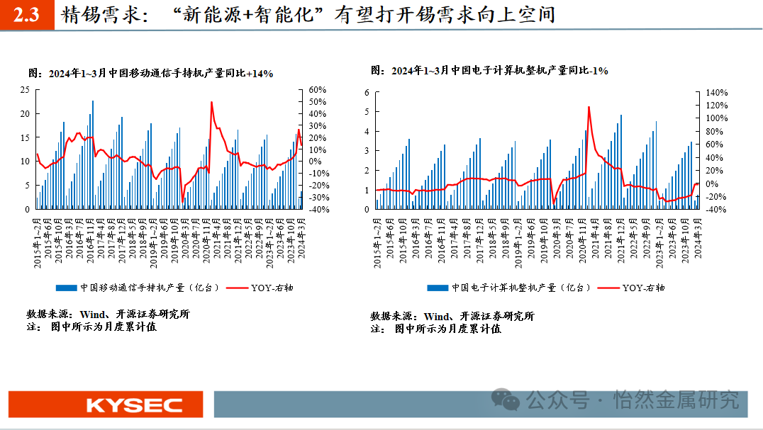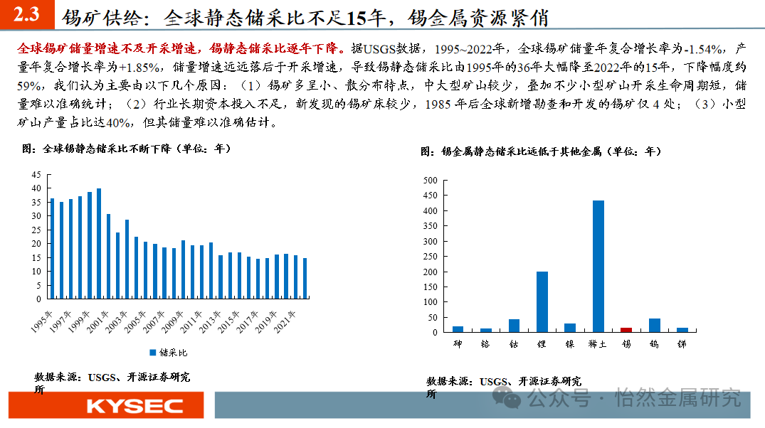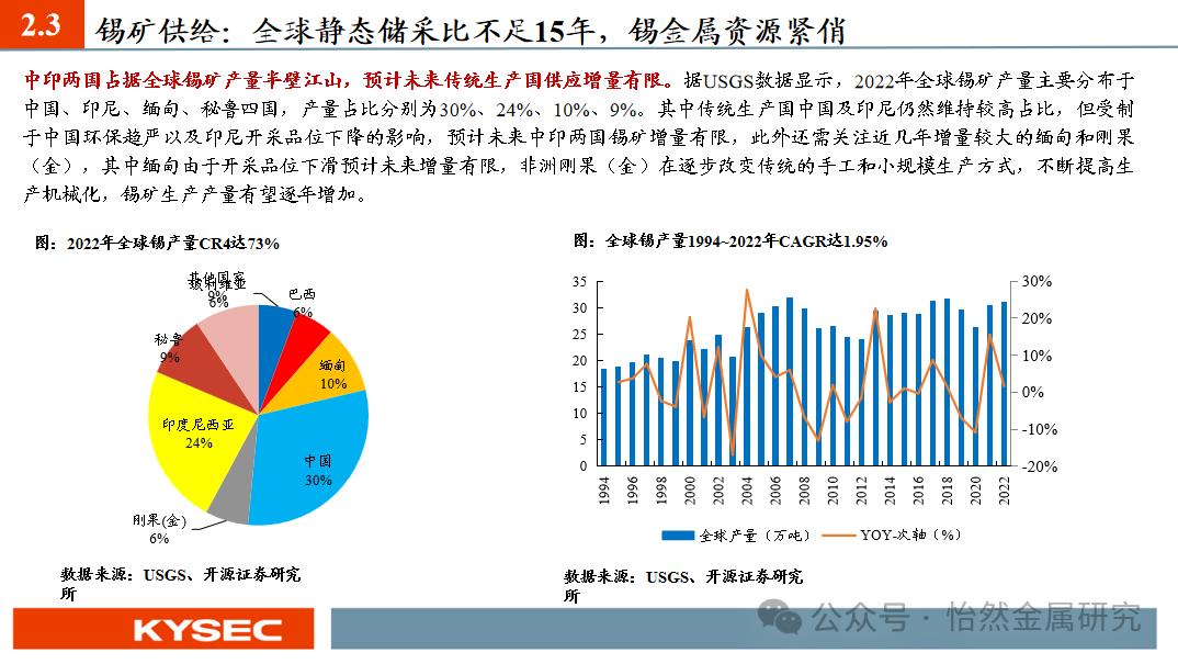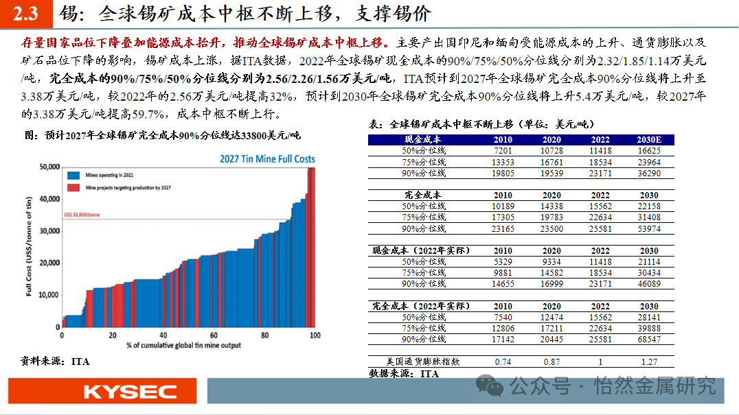 锡:供给端扰动频发,印尼出口量尚未完全恢复至正常水平,缅甸佤邦采矿端依旧处于停产状态,需求端中短期有光伏、新能源车等新能源领域以及半导体行业复苏的催化,长期有5G、AI、工业互联等蓝海市场的打开,供需格局较好;成本端,伴随资源枯竭锡矿开采成本中枢不断上移托举锡价,锡价中枢有望逐步上行。推荐标的:锡业股份;受益标的:华锡有色、兴业银锡。