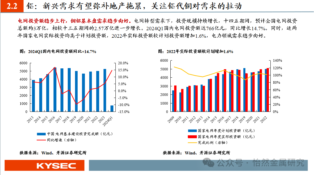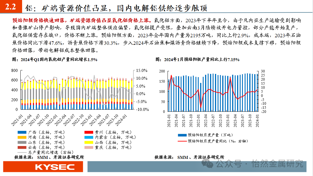 铝:供给端,国内4500万吨供给“天花板”迫近,海外电解铝投产缓慢,供给刚性格局逐步凸显;需求端,2024年预计地产端将会有一定拖累,但伴随铜价上涨,“铝代铜”市场空间或超预期。成本端,预焙阳极、电力成本不断下行,电解铝盈利能力得到修复,但晋豫矿山停产叠加几内亚铝土矿供应扰动频发,矿端资源价值凸显,氧化铝价格不断上涨,或蚕食部分电解铝环节利润;重新审视评产业链利润结构占比后,推荐标的:云铝股份,受益标的:天山铝业、南山铝业、中国宏桥、中国铝业、神火股份。