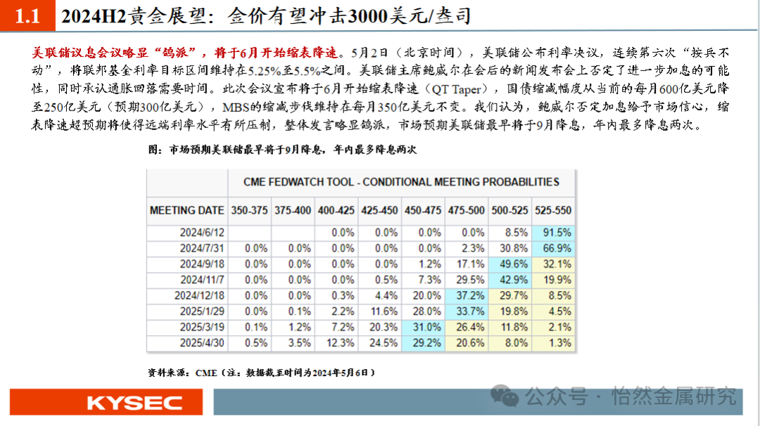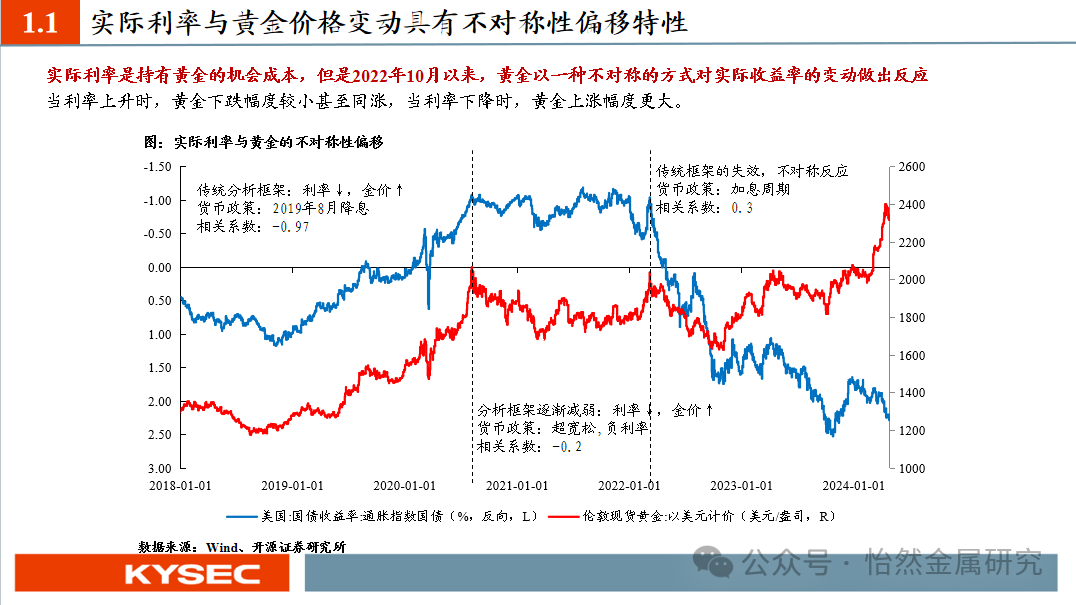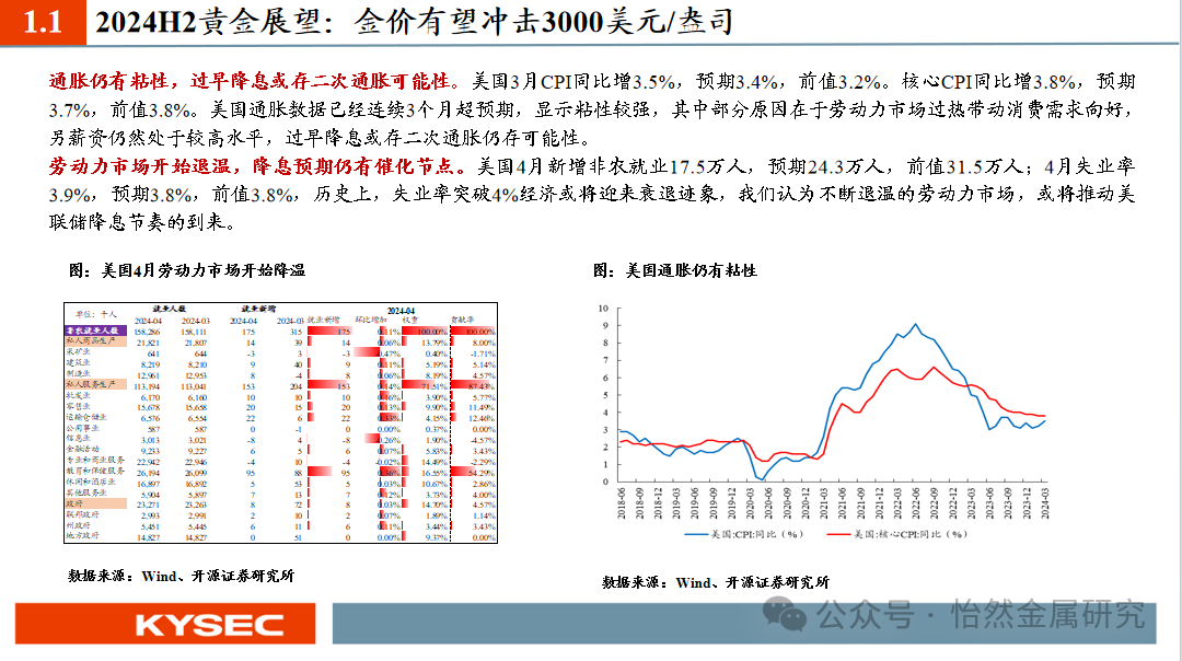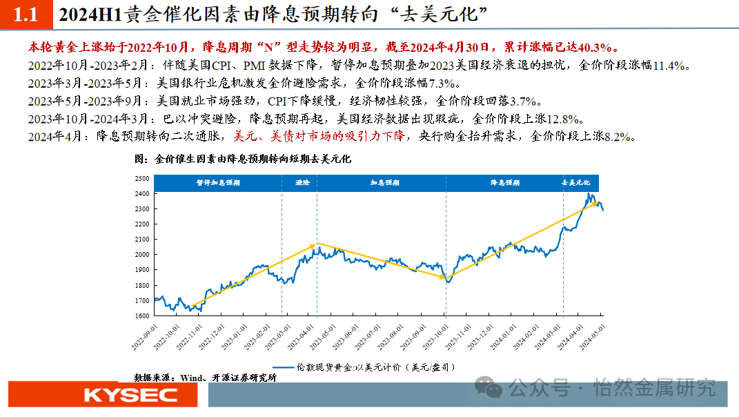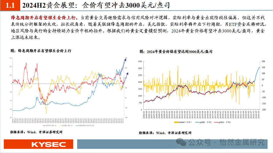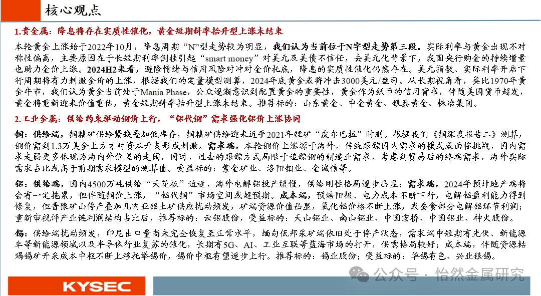 本轮黄金上涨始于2022年10月,降息周期“N”型走势较为明显,我们认为当前位于N字型走势第三段。实际利率与黄金出现不对称性偏离,主要原因在于长短期利率倒挂引起“smart money”对美元及美债不信任,去美元化背景下,我国央行购金的持续增量也助力金价上涨。2024H2来看,避险情绪与信用风险对冲对金价托底,降息的实质性催化仍然存在。美元指数、实际利率开启下行周期将有力刺激金价的上涨,根据我们的定量模型测算,2024年底黄金或将冲击3000美元/盎司。从长期视角看,类比1970年黄金牛市,我们认为黄金当前处于Mania Phase,公众逐渐意识到配置黄金的重要性,黄金作为纸币的信用背书,伴随美国货币超发,黄金将重新迎来价值重估,黄金短期斜率抬升型上涨未结束。推荐标的:山东黄金、中金黄金、银泰黄金、株冶集团。