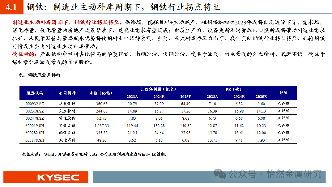 供给端,能耗目标+主动减产,粗钢供给相对2023年或将出现边际下降。需求端,消化存量,优化增量的房地产政策背景下,建筑业需求有望筑底;新质生产力、设备更新和消费品以旧换新或将带动制造业需求抬升,人民币贬值与蒙煤成本优势将使钢材出口维持景气,当前,五大材库存压力尚可,我们判断钢铁行业拐点将至,此轮钢铁行情或主要由制造业主动补库带动。受益标的:华菱钢铁、南钢股份、宝钢股份、久立特材、武进不锈、常宝股份。