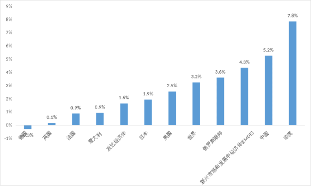 2023年,受地缘政治影响持续、美联储加息步伐未停、金融突发事件打击等多重因素的影响,世界经济总体下行,但不同经济体间分化明显。发达国家由于政策收紧,平均经济增速从2022年的2.6%放缓至2023年的1.6%;新兴市场和发展中国家的经济增速表现稳定,从2022年的4.1%小幅升至2023年的4.3%。2023年新兴市场与发展中经济体增速高于发达经济体增速。具体来看,印度是新兴市场与发展中经济体中增速最快的国家;美国则是发达经济体中表现最佳的国家;德国经济增速为-0.3%,是唯一负增长的发达国家;和德国相比,受西方制裁和通胀压力影响的俄罗斯,在2023年实现了经济正向增长,GDP实际增长3.6%。