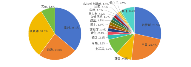 从2023年俄铝的主要客户分布来看,亚洲地区是其最大的销售市场,2023年占比高达36.1%。其次是独联体国家和欧洲,占比为31.3%和24.0%。在欧美的制裁下,俄罗斯将铝锭更多地销往亚洲地区,中国是主要目的地,2023年俄铝来自中国的收益占比高达23.4%,这一数值在2021年仅为6.4%。
