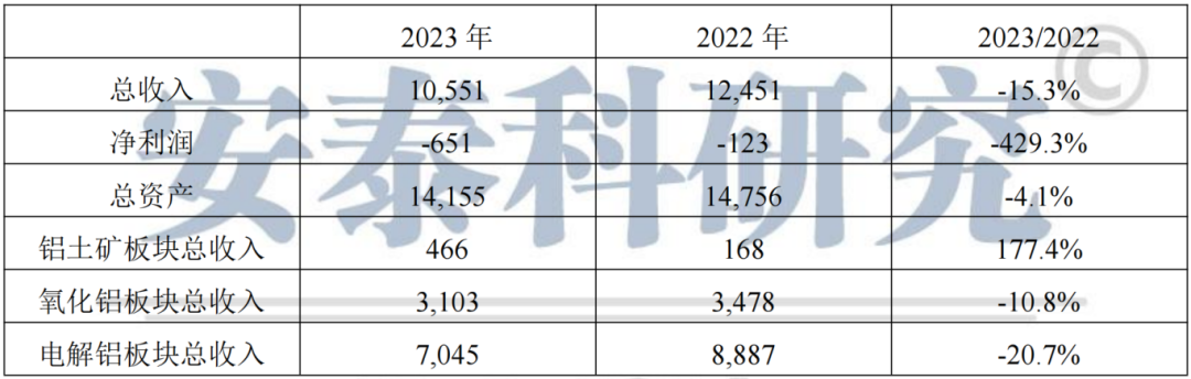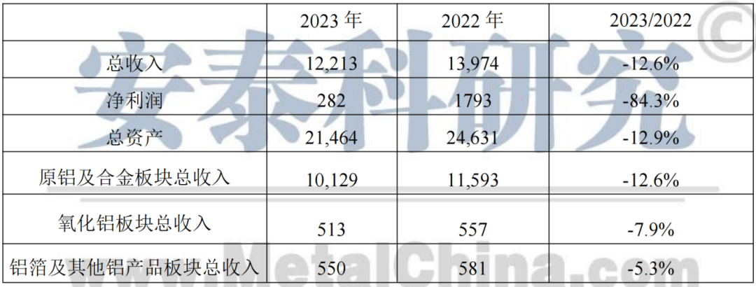 自2021年3月出售Warrick轧制厂后,美铝公司一直专注于上游铝土矿、氧化铝、电解铝的业务组合发展。2023年,美铝总收入为105.51亿美元,较上一年下降15.3%,净利润-6.51亿美元,较上一年大幅下降429.3%。