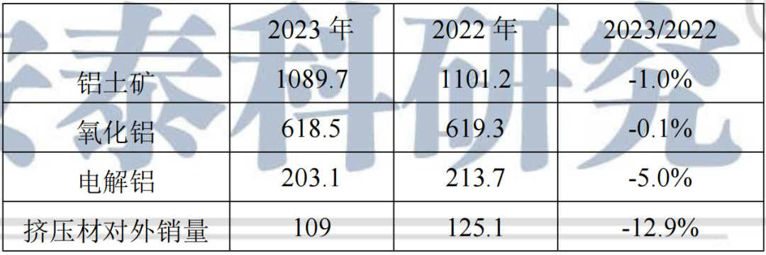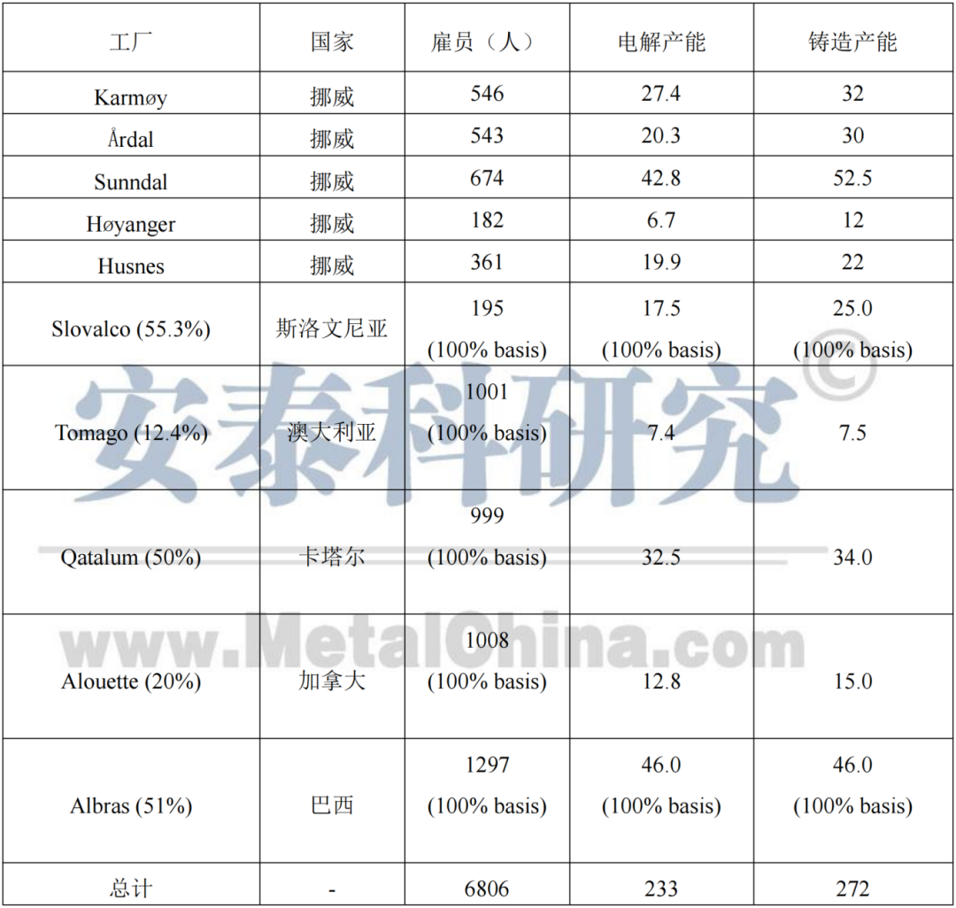 表1 2023年国外主要跨国公司主要铝产品产量和经营情况